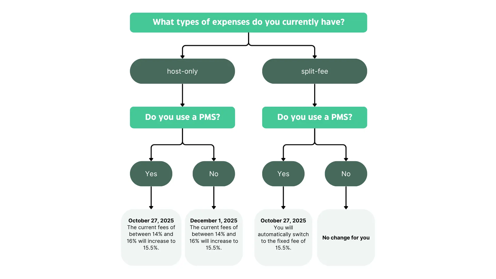 Les hôtes qui ne sont pas connectés via PMS (et restent en mode “split-fee”) ne subiront pas de changements mais ceux qui sont en mode "host-only" (frais fixes) peuvent continuer à l'être jusqu’au 1ᵉʳ décembre 2025, date à laquelle le changement s'appliqueras aussi a eux ils verront donc le taux actuel qui varie entre 14% et 16% passer à 15.5%.
